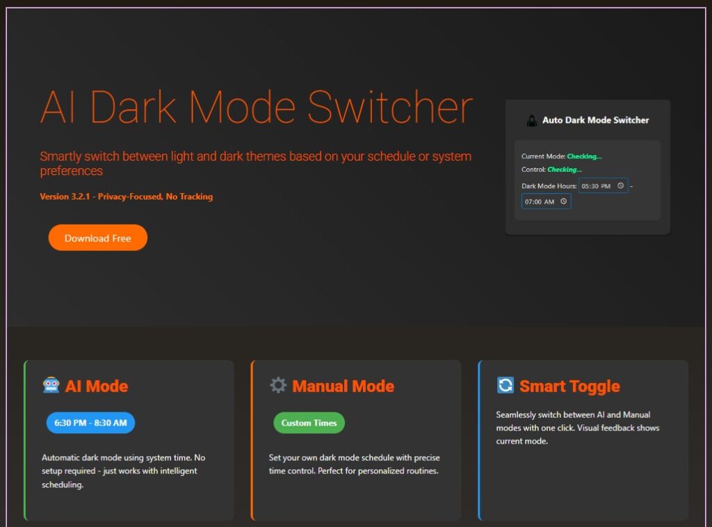 The AI Dark Mode Switcher solves this problem by automatically switching Chrome to dark mode during evening hours and back to light mode during the day. It's designed specifically for night owls who need a healthier browsing experience while working on projects, debugging code, or studying late at night.